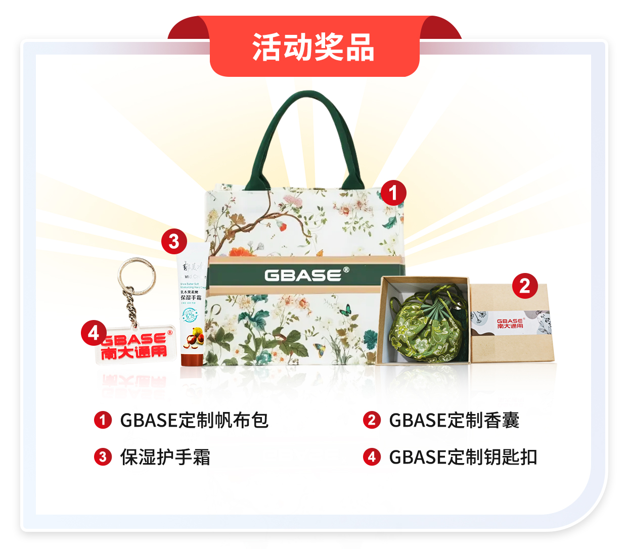 2)随机抽取10名幸运小伙伴发放“GBASE定制礼品”(内含:定制帆布包 + 主题香囊 + 精致钥匙扣 + 郁美净);