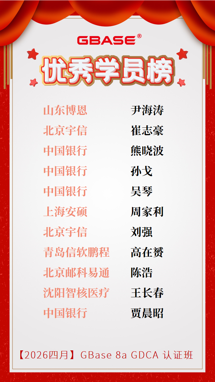 本次培训共有11人成绩优秀而入选本期培训优秀学员榜单,免费获得GBase管理工程师纸质证书!!