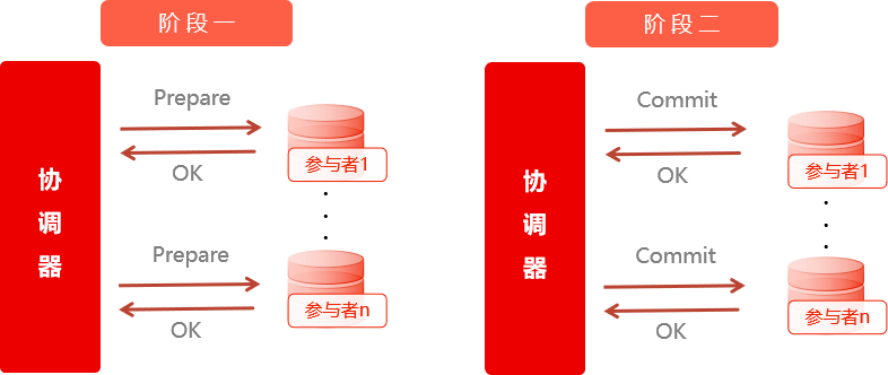 所谓2PC( Two-Phase Commit)即两阶段提交协议,顾名思义,就是将事务的提交过程分成了两个阶段来进行处理,包括准备阶段P(Prepare phase)、提交阶段C(Commit phase)。在分布式事务中,有两个执行主体,分别是“协调器”和“参与者”,其中“协调器”接受应用的请求,“参与者”执行“协调器”下发的指令,完成数据的持久化操作。在2PC协议中,协调器和参与者相互配合,共同实现事务的ACID特性。