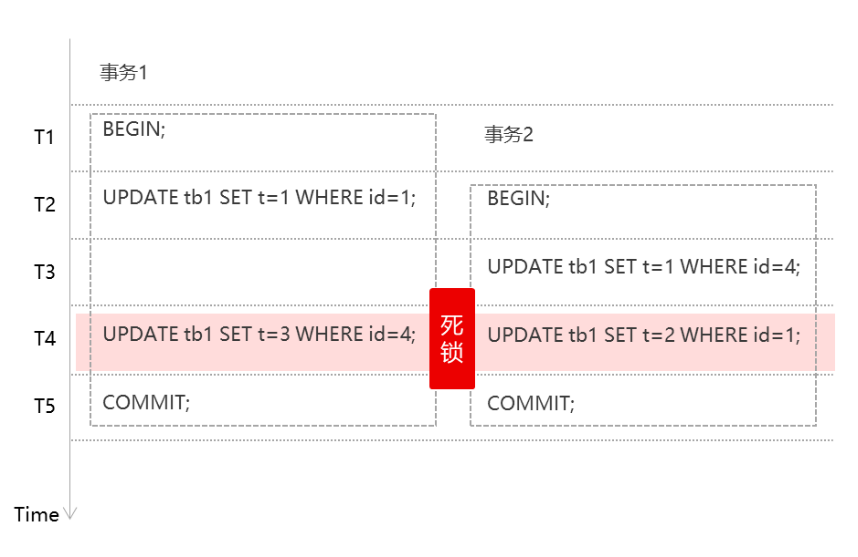 如上图中所示,在T1这个时刻,事务1 开始(begin),在T2时刻,事务1 更新(update)了id=1行的t(列)值,同时事务2 开始(begin)。在T3时刻,事务2更新(update)了id=4行的t(列)值。然后在T4时刻,事务1想要更新id=4的t值,同时事务2想要更新id=1的t值,此时就会互相等待,形成全局死锁。