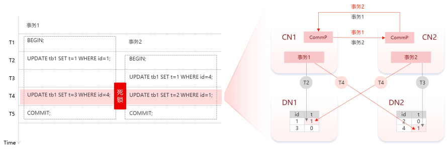当事务1发现要update的数据被其他锁住后,会将这个等待信息发送给锁住数据的那个节点,在这个例子里面就是发起事务2的CN2节点;然后同时事务2发现要update的数据被事务1锁住了,也会在等待超时时间以后,将这个等待信息发送给事务1所在的节点就是CN1。这样事务锁住的时候,后台首先等待一个预先设定的超时时间,当超过这个时间两个节点就发现了他们的等待环,那么首个发现环的节点会将自己的事务退出,从而解除全局死锁的这个问题。
