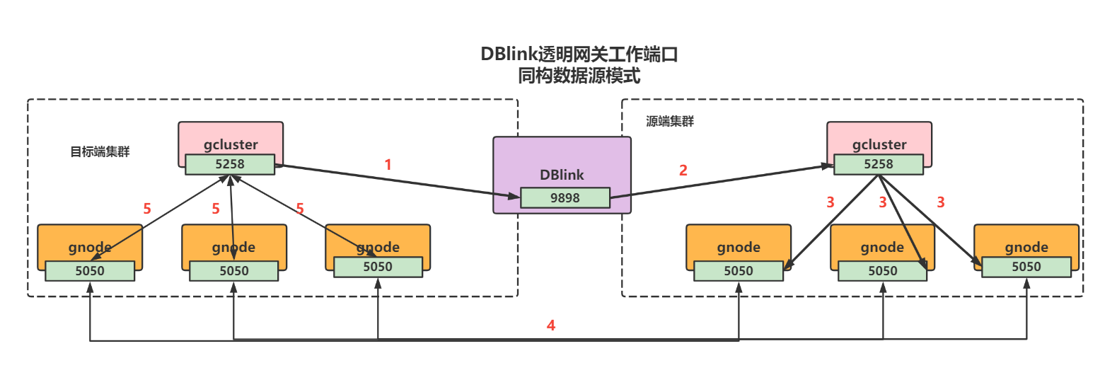 (1)目标端集群将数据请求由gcluster的5258端口发送至dblink的9898端口