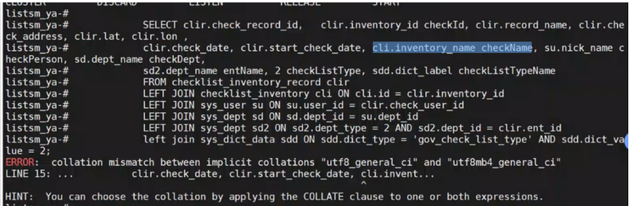 报错: ERROR: could not determine which collation to use for view column "check_name"
