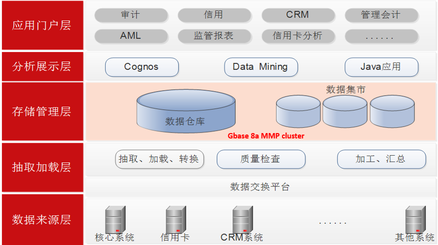 此次替换数据仓库使用GBase 8a MPP Cluster完成海量数据的统一存储、管理、信息共享和数据资源服务,并作为应用系统的支撑,针对不同的业务建立不同的专题,建立完善的数据采集、加载、存储、分析和应用展示的架构。