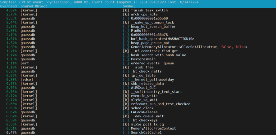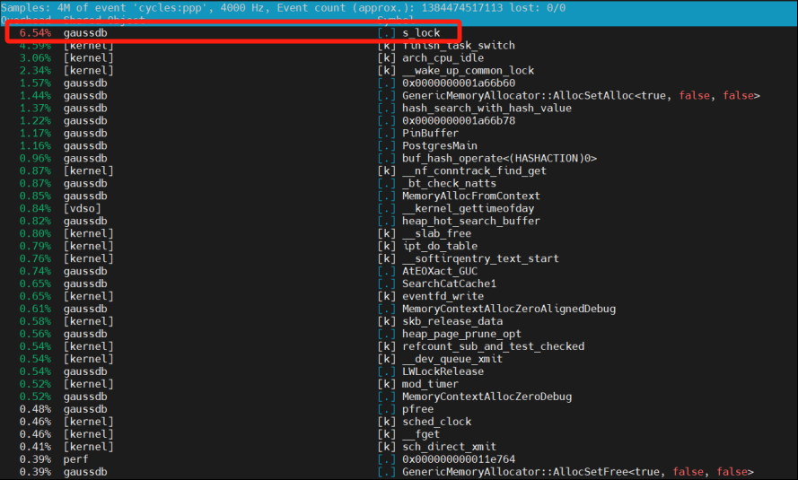 (3)使用perf top监控s_lock相关热点函数(如图中红框标注):