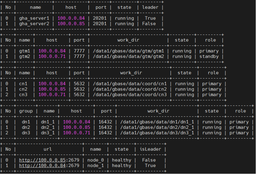 | 100.0.0.84 | 鲲鹏920 128cpus 1TMEM/512GB 硬盘NVME 网络万兆 | GBase 8c V5 |