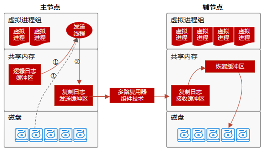 - 日志发送线程使用“服务器多路复用器组”(SMX) 将数据复制缓冲区发送至辅节点的日志接收线程。