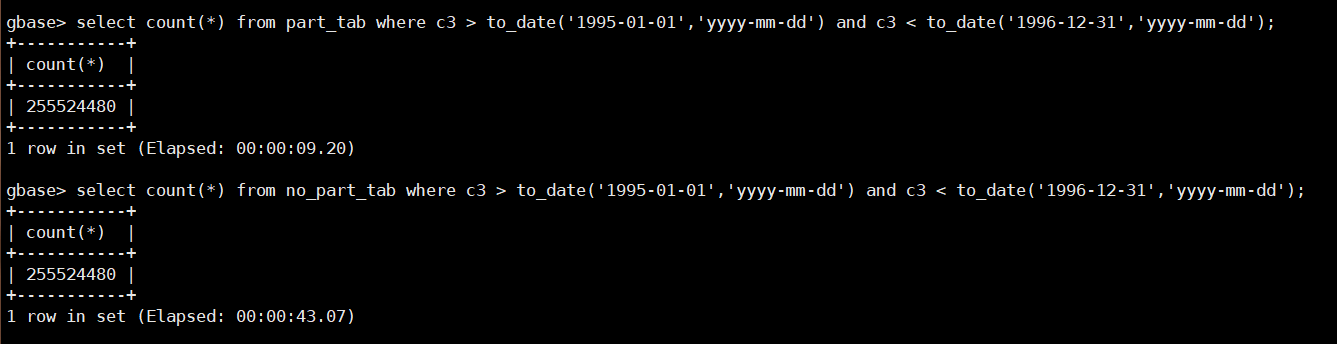select count(*) from no_part_tab where c3 > to_date('1995-01-01','yyyy-mm-dd') and c3 < to_date('1996-12-31','yyyy-mm-dd');示例如下: