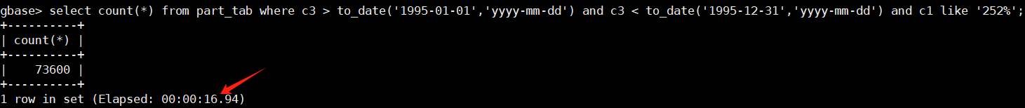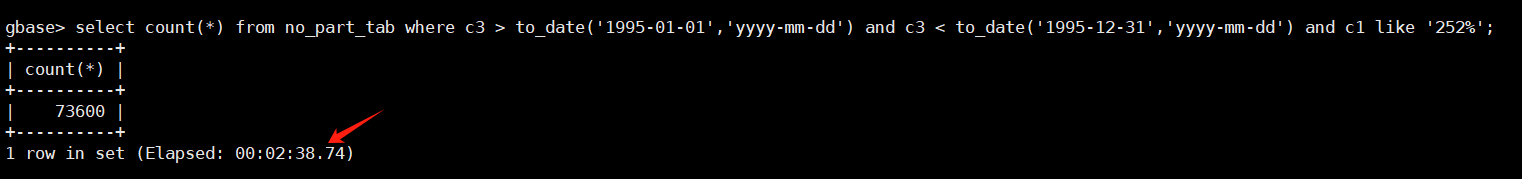 select count(*) from no_part_tab where c3 > to_date('1995-01-01','yyyy-mm-dd') and c3 < to_date('1995-12-31','yyyy-mm-dd') and c1 like '252%';示例如下:
