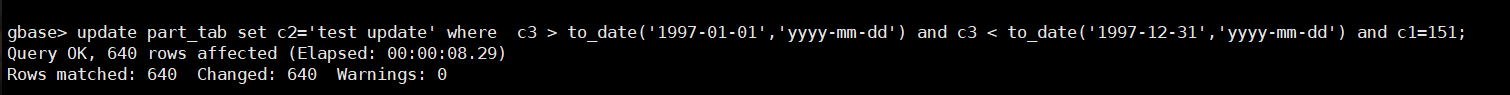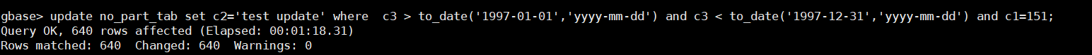 update no_part_tab set c2='test update' where c3 > to_date('1997-01-01','yyyy-mm-dd') and c3 < to_date('1997-12-31','yyyy-mm-dd') and c1=151;示例如下: