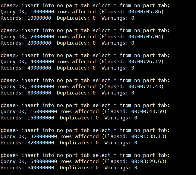 insert into no_part_tab select * from no_part_tab;示例如下: