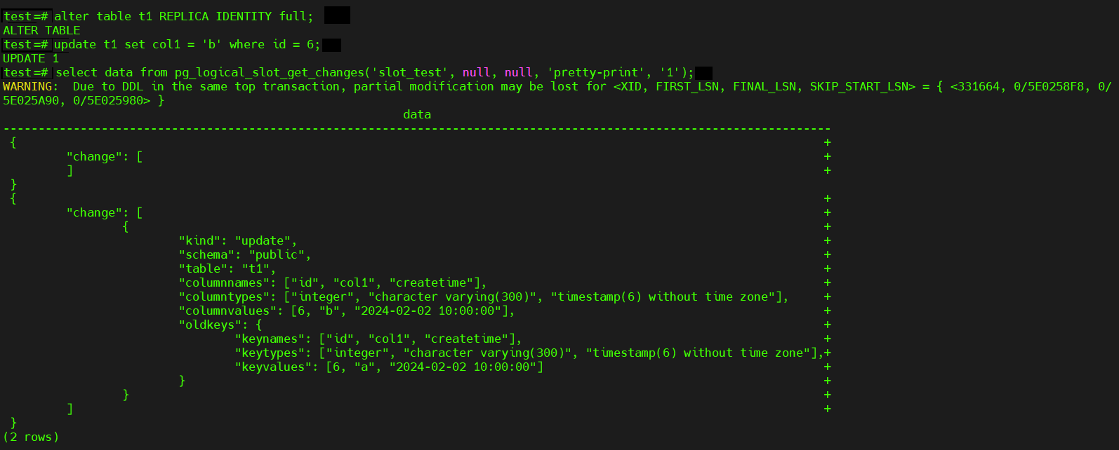 select data from pg_logical_slot_peek_changes('test_slot', null, null, 'pretty-print', '1');