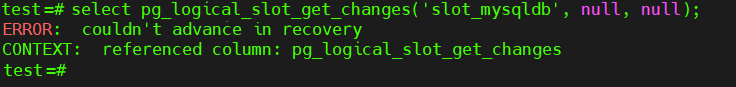 A创建复制槽,在B中可以查到复制槽信息,同时也能够逻辑解码,获取到数据变更,但是B库无法推进复制槽。如下图所示: