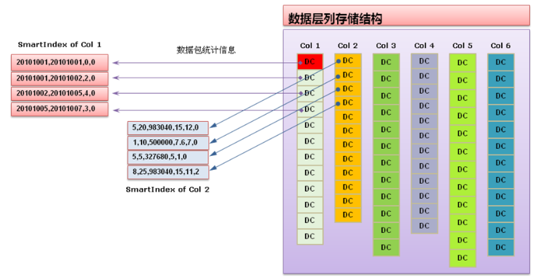 在每个数据包之上会由数据库系统自动创建和维护智能索引(SmartIndex),智能索引记录的是该包中数据的统计信息,包括最大值、最小值、和值、NULL值个数。