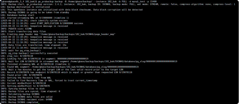 gs_basebackup:恢复时可直接用备份文件替换原有文件,或在备份库上直接启动数据库,恢复速度快。结合 PITR(时间点恢复),可恢复至全量备份时间点后的指定时间点。例: