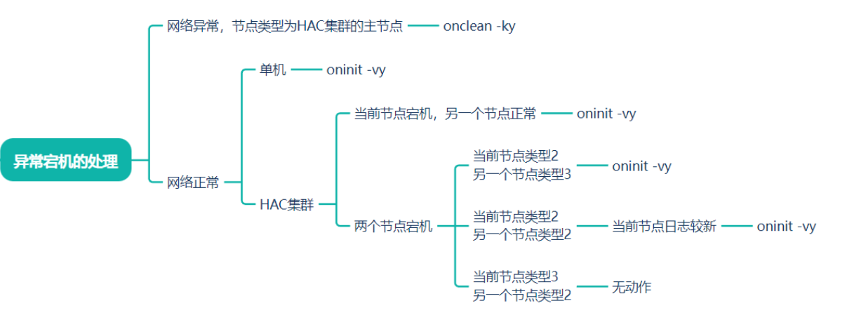 - HAC异常宕机处理:异常宕机情况根据应用网络连接情况分为网络正常和网络异常两种场景。如果主节点网络异常,备节点网络正常,则关闭主节点数据库服务,完成备节点切成主节点操作。如果主备节点网络都正常,两节点中其中一个节点正常,则在另一个节点直接启动数据库服务;如果两节点都异常,则先判断主节点,再按照上诉规则1启动数据库服务。