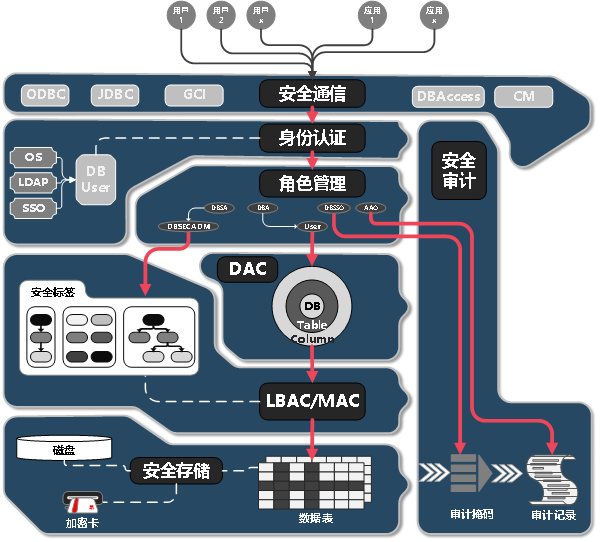 • 安全模块:提供等保四级级别(TCSES B2级)的安全保护功能,由身份鉴别、自主访问控制、标记与强制访问控制、安全审计、可信路径、推理控制、SSODB自身保护等部分组成;