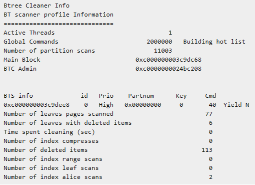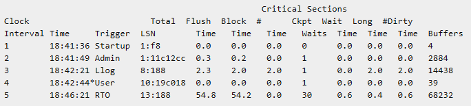 curlog 和 logposit 字段提供了逻辑日志记录的确切位置。如果事务不在回滚,curlog 和 logposit 描述最新写入的日志记录的位置。当事务正在回滚时,这些字段描述最新“撤销”的日志记录的位置。随着事务的回滚,curlog 和 logposit 值下降。在长事务中,logposit 和 beginlg 值的聚集率可以帮助您估计回滚还将花费多少时间。