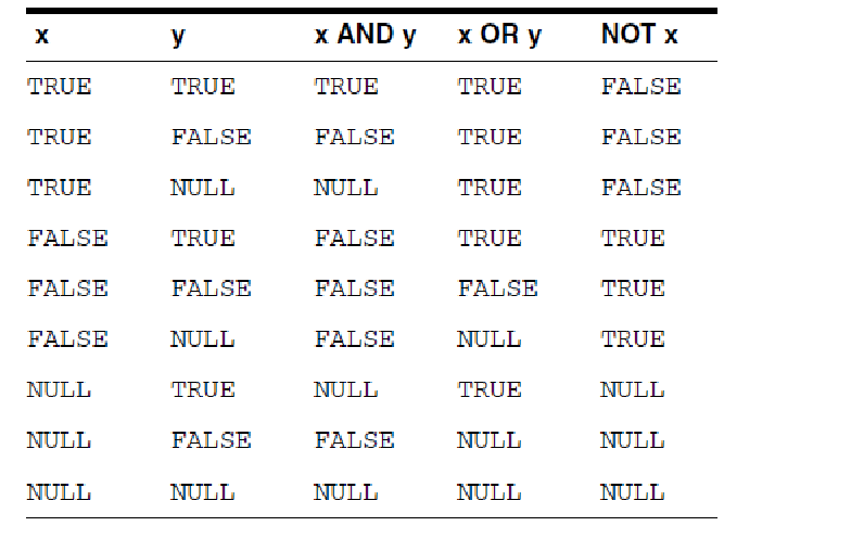 通常,布尔表达式由逻辑运算符AND、OR和NOT连接。布尔表达式总是产生TRUE、FALSE或NULL。