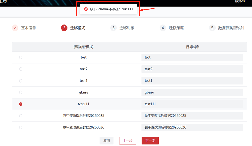 当目标端数据库不存在时,点击“下一步”按钮,会报错,并提示弹窗,如下图所示: