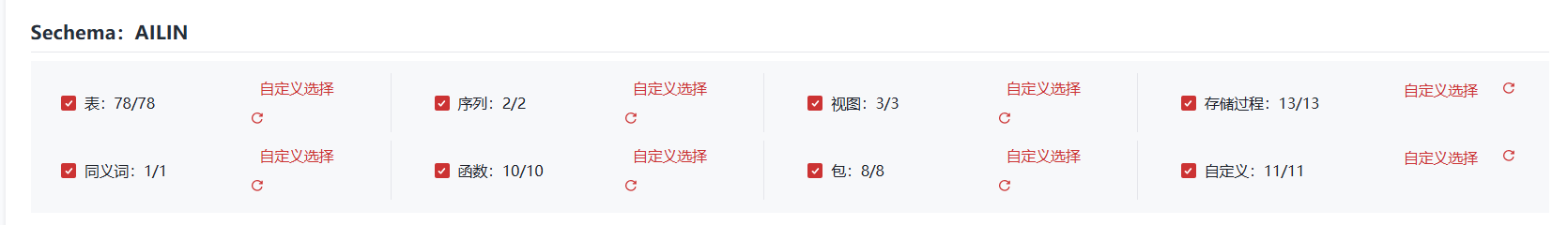 默认会勾选所有对象的全部,如果您想迁移部分对象,可以点击“自定义选择”按钮,会出现“表自定义”弹窗,如果您点击“刷新”按钮,会恢复默认选中全部对象,如下图所示:
