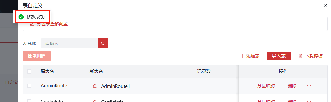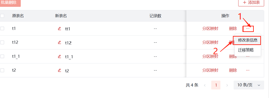 您可以对表的列信息进行修改,选择“。。。”会弹出“修改表信息”和“迁移策略”弹窗