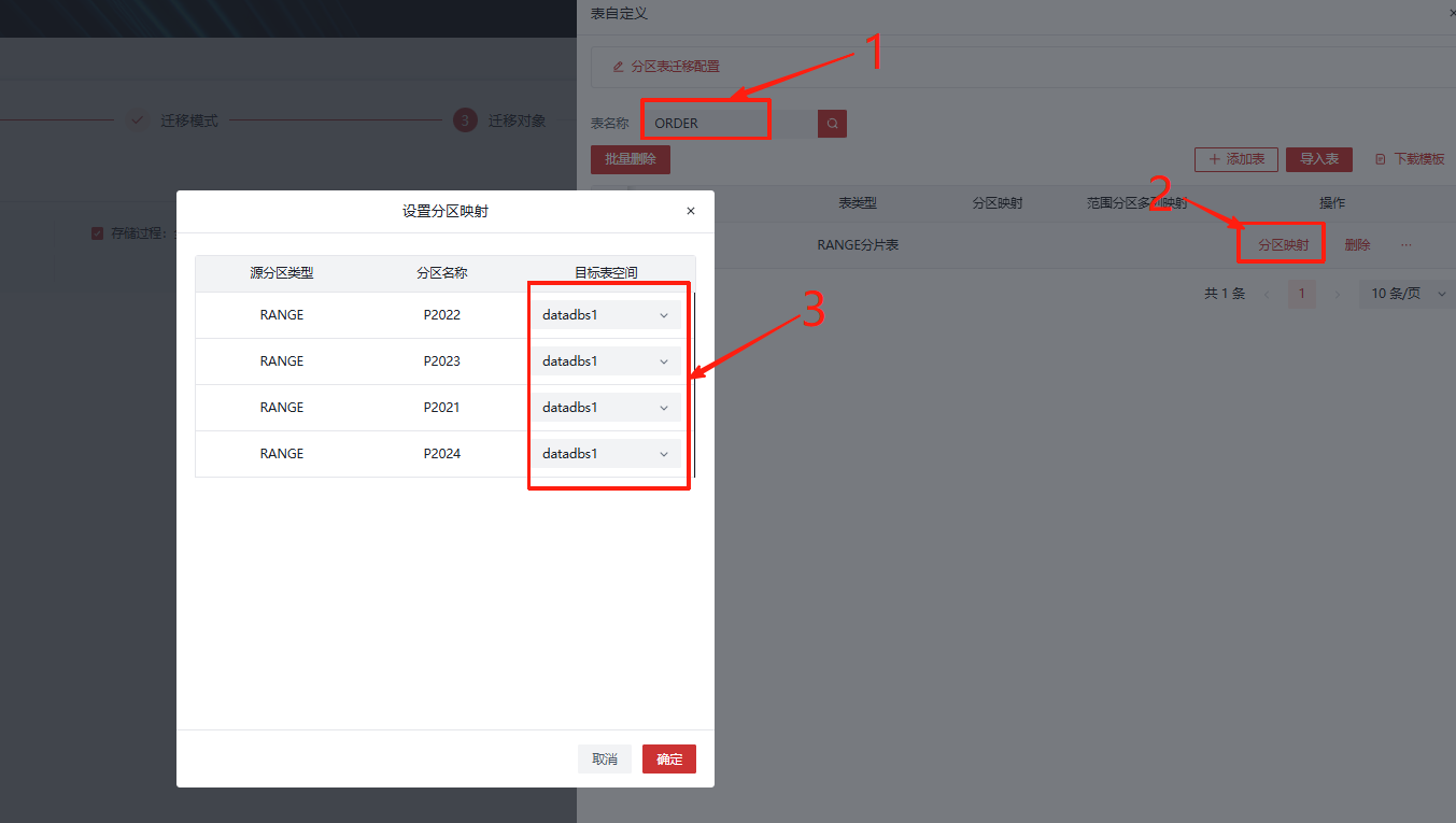 - 手动迁移:选择手动迁移,您可以针对每一个分区表,设置对应的表空间,如下图所示: