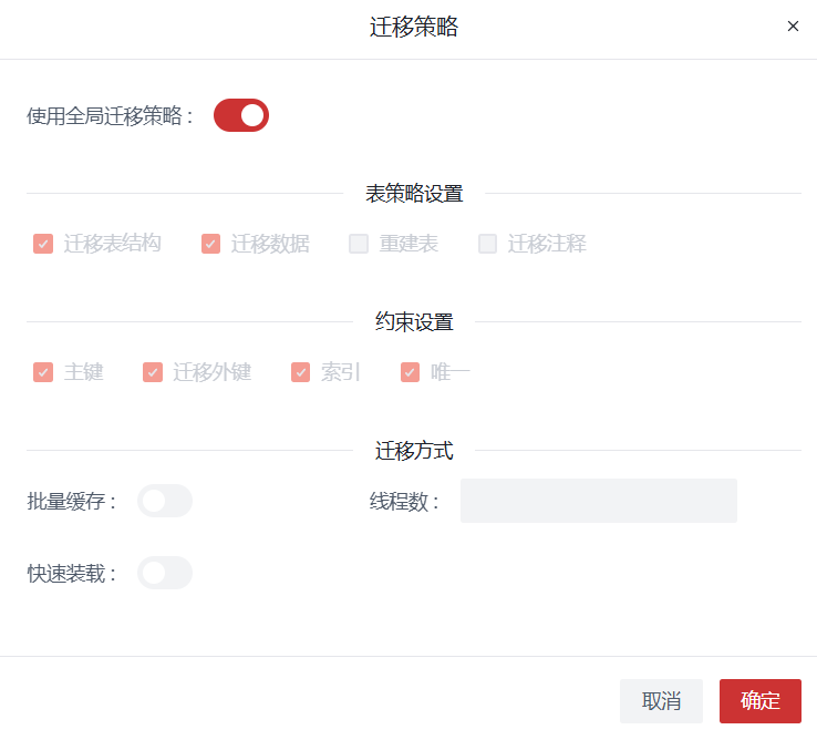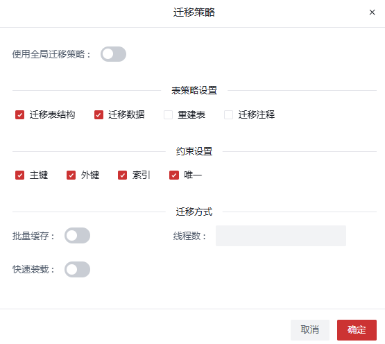 开启全局迁移策略的时候,该表的迁移策略与外侧的所有的迁移 策略保持一致。当这个页面不开启全局迁移策略的时候,该表的迁移策略使用当前的 页面配置的迁移策略,如下图所示: