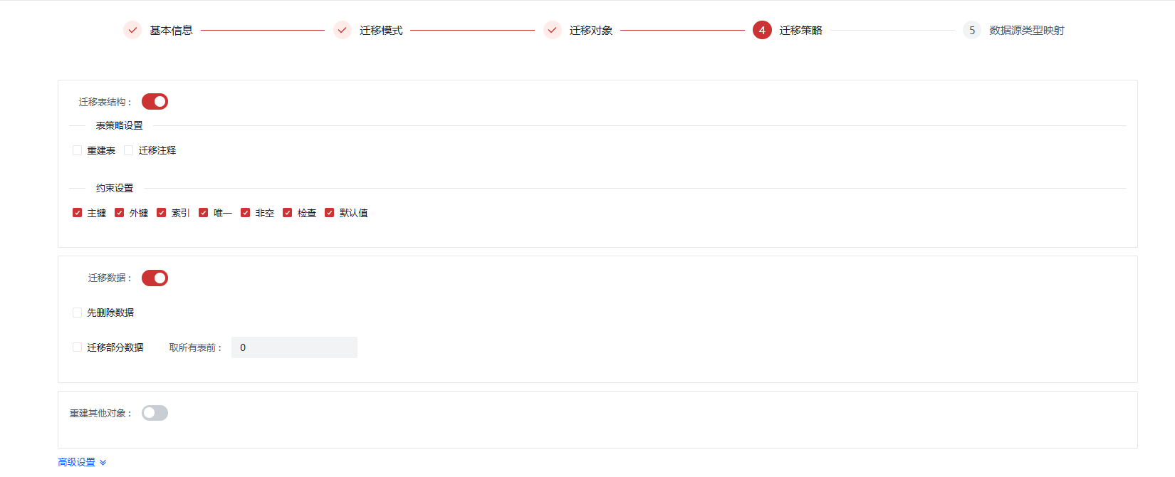 - 迁移表结构:开启“迁移表结构”按钮,则迁移您选中的所有表结构,关闭“迁移表结构”,则仅迁移数据,不迁移表结构