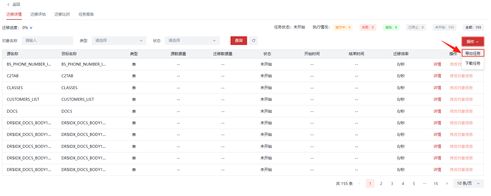 - 状态:您迁移任务中所包含每个对象的迁移状态,状态种类与“左侧状态栏”种类一致