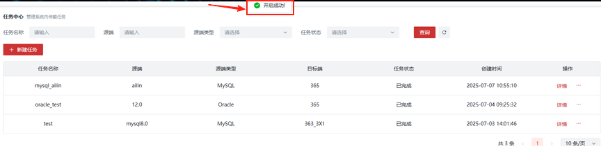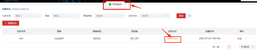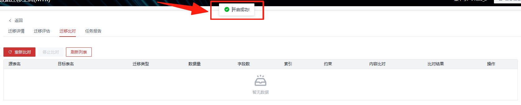 然后点击“确定”按钮,开启迁移比对,会提示“开启成功”弹窗,如下图所示: