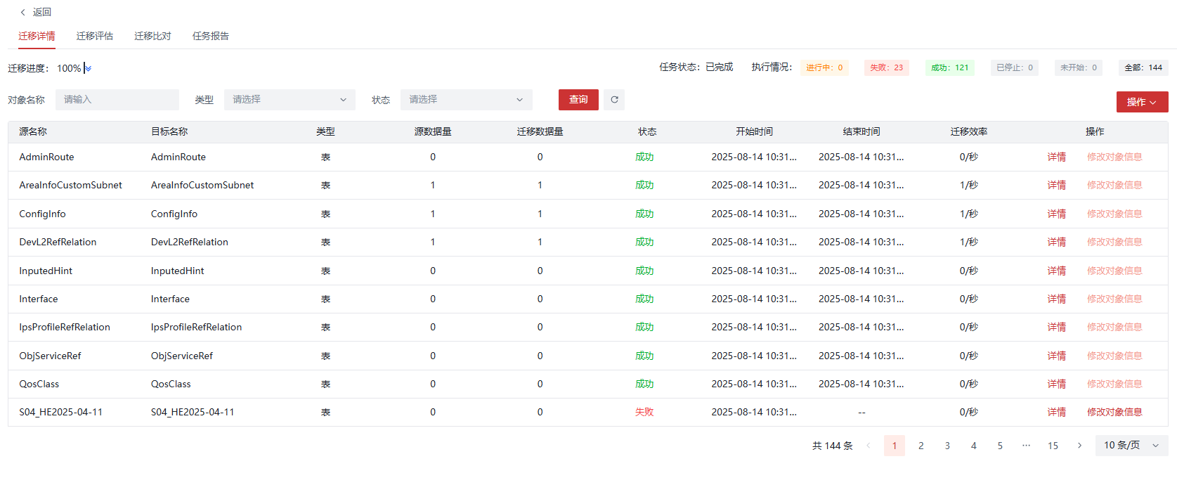 - 结果信息:您选中对象的迁移结果信息。有成功或者报错的情况,如果报错,会打印出报错的详细信息