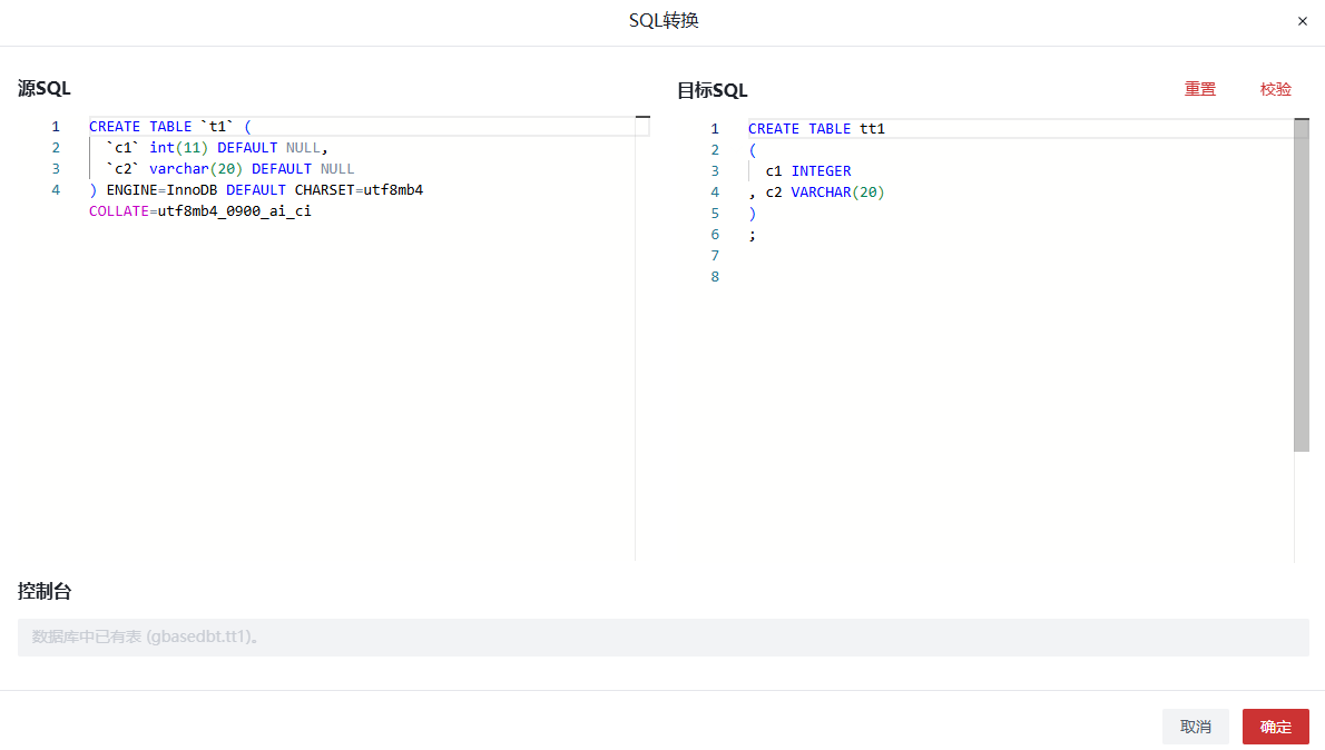 - 校验:会检查您当前目标SQL是否可以执行成功,点击“校验”后,如果控制台显示“SQL语句校验通过”,然后点击“确定”按钮进行保存即可。修改后SQL在您进行二次迁移时可以迁移成功。二次迁移操作请查看“二次迁移”章节