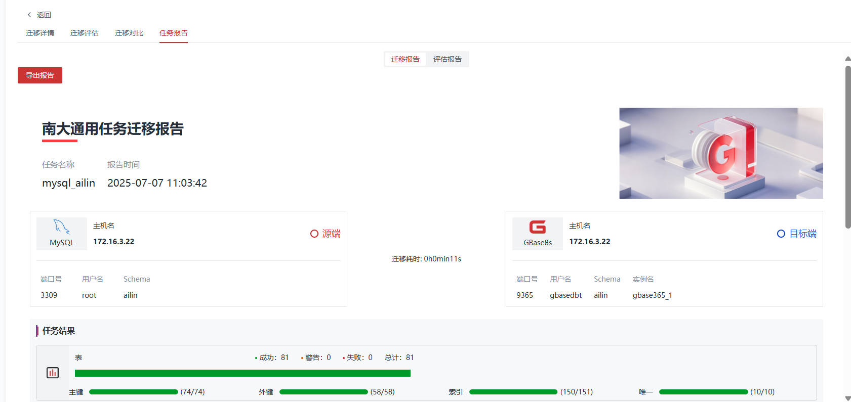 如果您进行了迁移比对,在“任务报告”页面下方,会展示出您数据比对的报告,如下图所示: