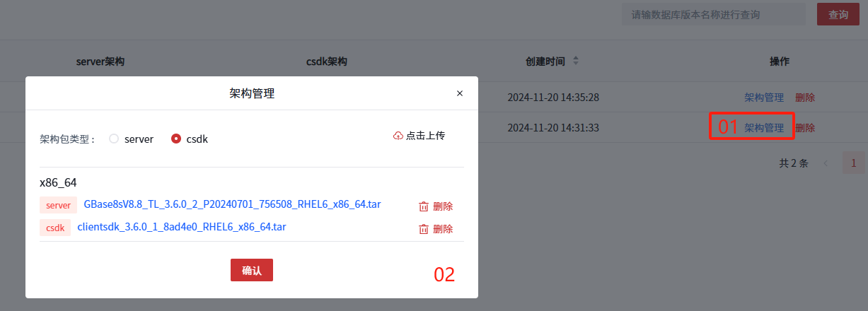 通过【版本管理】界面可以管理软件安装包,将浏览器端的数据库安装包或csdk安装包上传到GEM所在服务器存储,便于之后的安装操作使用。