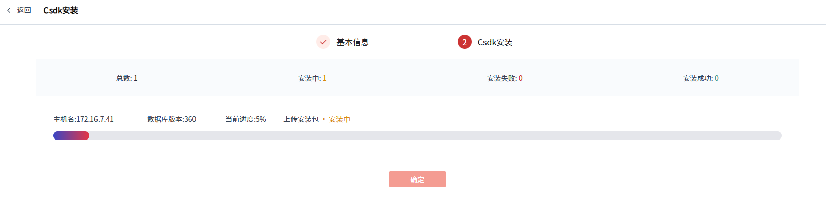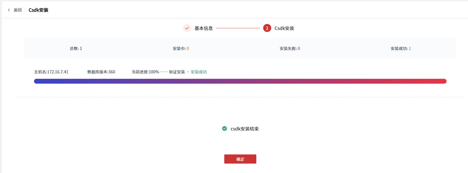 安装成功后,点击【确定】退出配置页面。可以在安装部署首页的【安装历史】查看成功安装csdk的记录,详见 “4.5 历史查看”。