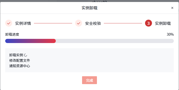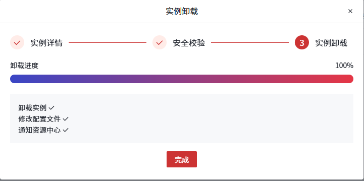 工具完成实例卸载后自动同步资源中心/实例管理将对应实例删除,如有延迟,可以执行手动刷新。
