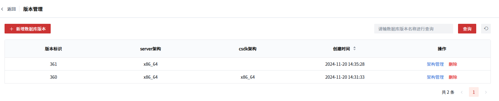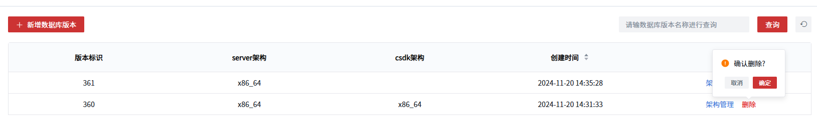 【架构管理】是维护版本标识下的安装包,通过新增和删除操作实现版本标识对应安装包的修改,同一版本标识下可以既包含server安装包又包含csdk安装包。