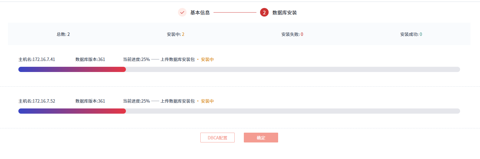 校验通过后进入安装部署进程页面,自动开始执行安装,批量安装时页面展示全部安装任务: