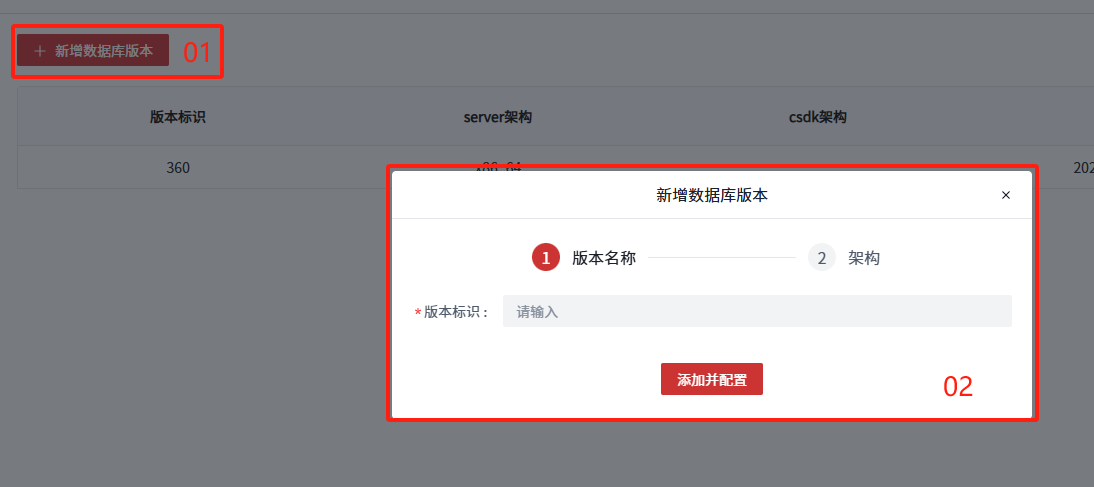 点击【+ 新增数据库版本】,在弹出的新增数据库版本弹窗中输入版本标识名称,点击【添加并配置】: