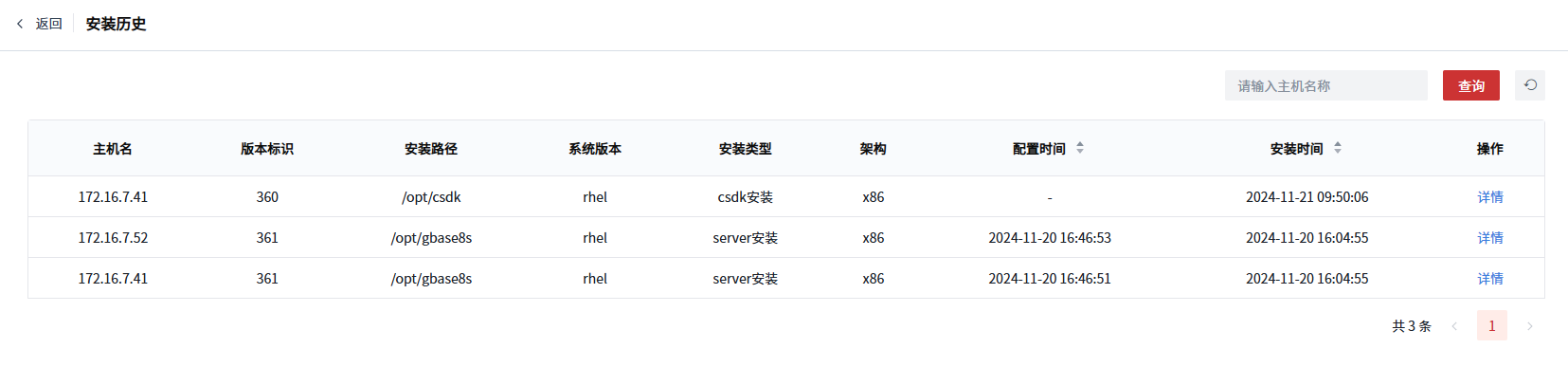 页面展示数据库安装、csdk安装和DBCA配置的历史记录,包括安装主机、安装路径、安装时间等信息: