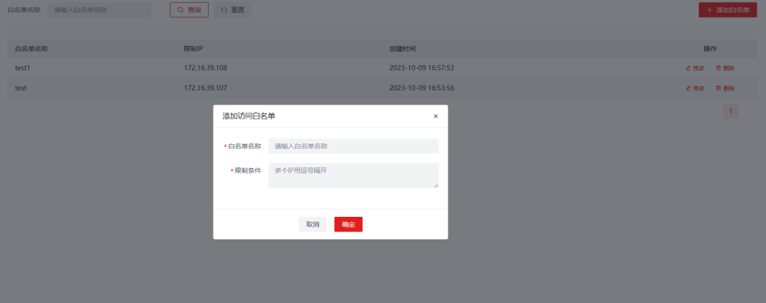 如下图所示,点击安全中心-访问白名单右上角的添加白名单,在弹出框中填写白名单名称和允许访问的IP地址,多个IP地址间用逗号隔开,确认即可完成添加。