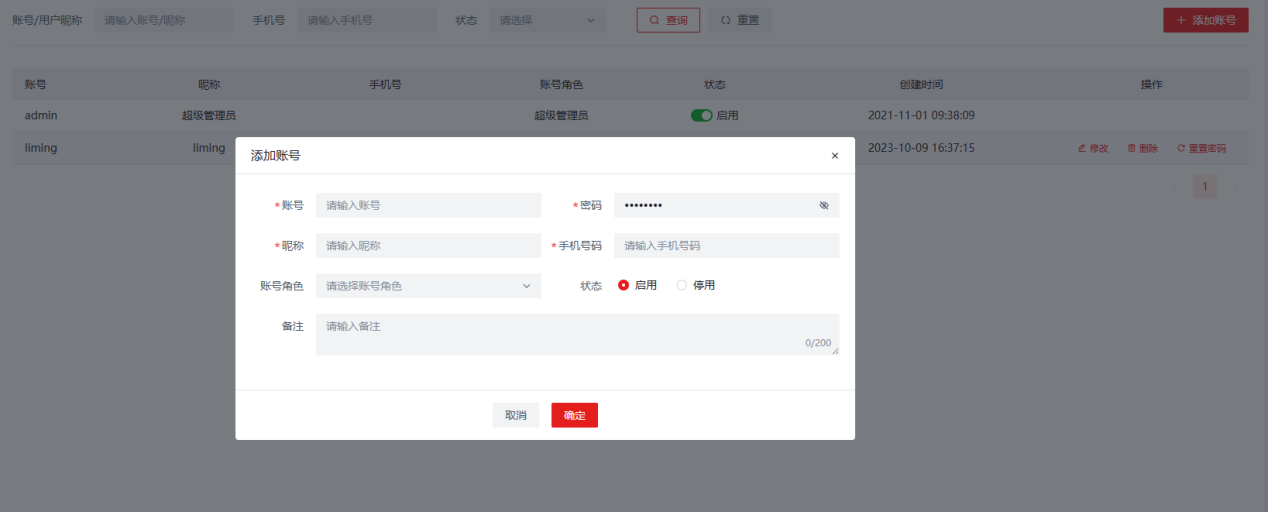 账号管理支持为GEM工具管理用户,包括新增用户、修改用户信息及分配角色、删除用户、重置密码、启停用户等操作。 如下图所示,点击安全中心/账号管理右上角的【+ 添加账号】,在弹出框中填写相应字段,分配用户角色,不选择角色则没有任何权限,点击确定即可完成账号添加。