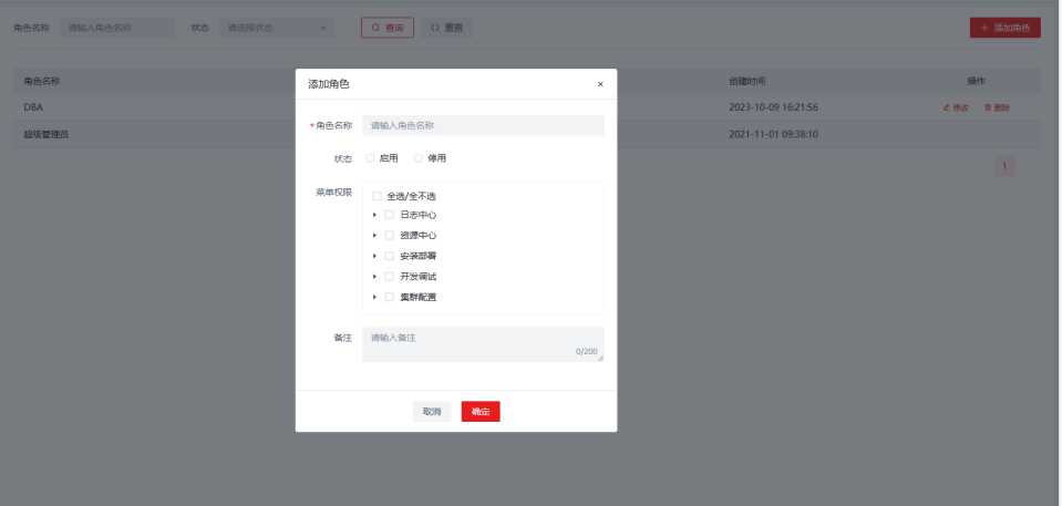 角色是特定权限的组合,通过赋予用户角色可以来管理用户权限,一个用户只能拥有一个角色。 在角色与权限页面支持新增、修改、删除、启停角色操作。创建或编辑角色时,可以为角色配置权限范围,包括已经安装的插件的访问权限。出于安全性设计的考虑,任何添加的角色都无法拥有安全中心的访问权限,安全中心的权限被固定在超级管理员(即安装后就有的系统内置账号 admin)身上。 如下图所示,点击安全中心/角色与权限右上角的【+ 添加角色】,在弹出框中填写角色名称,并勾选允许访问的菜单项,可以选择多个菜单项,可以全选,可以添加备注,确认即可完成添加。