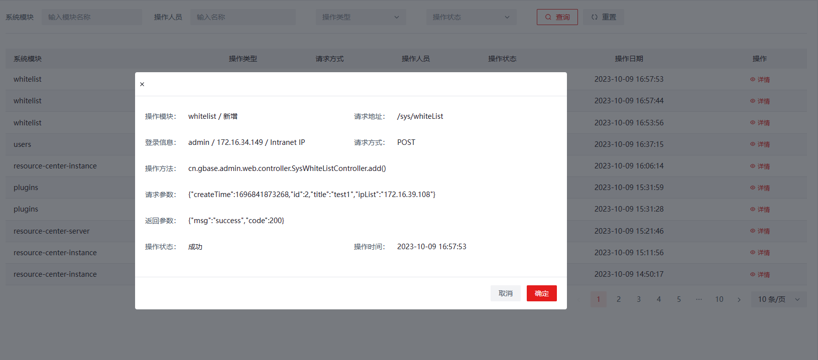 如图,在操作日志管理页面可以通过搜索找到对应的日志文件,点击【详情】查看该操作的详细参数。