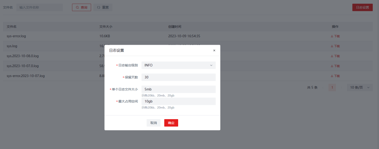 在系统日志管理页面可以通过搜索找到对应的日志文件,点击下载日志文件。 如下图所示,点击日志中心/系统日志右上角的日志设置,在弹出框中可以进行如下系统日志配置:
