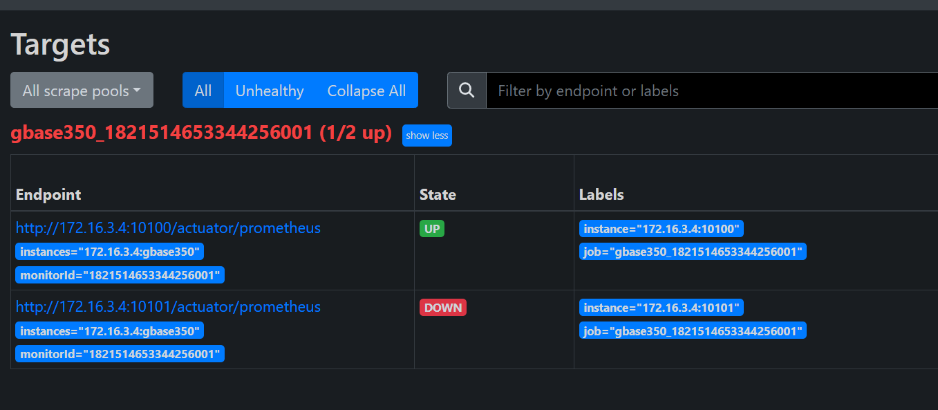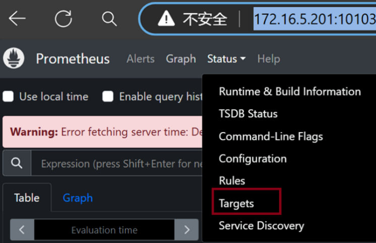 通过 http://IP:10103/ 进入Prometheus web UI 客户端,点击 【Status】/【Targets】 菜单: