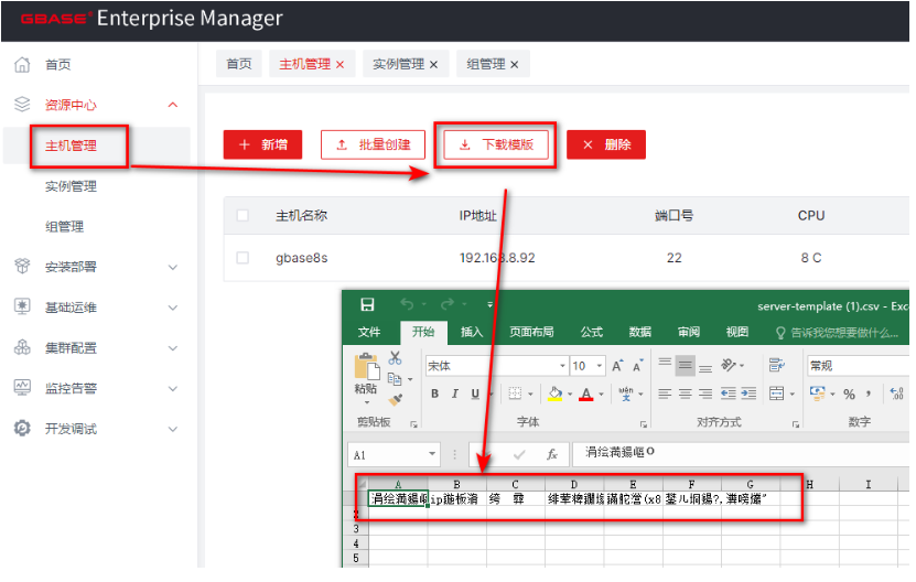资源中心的主机、实例页面具有下载模板以支持批量上传需求,下载的模板通过wps打开是正常的,但是通过excel打开会出现乱码的情况,如下所示: