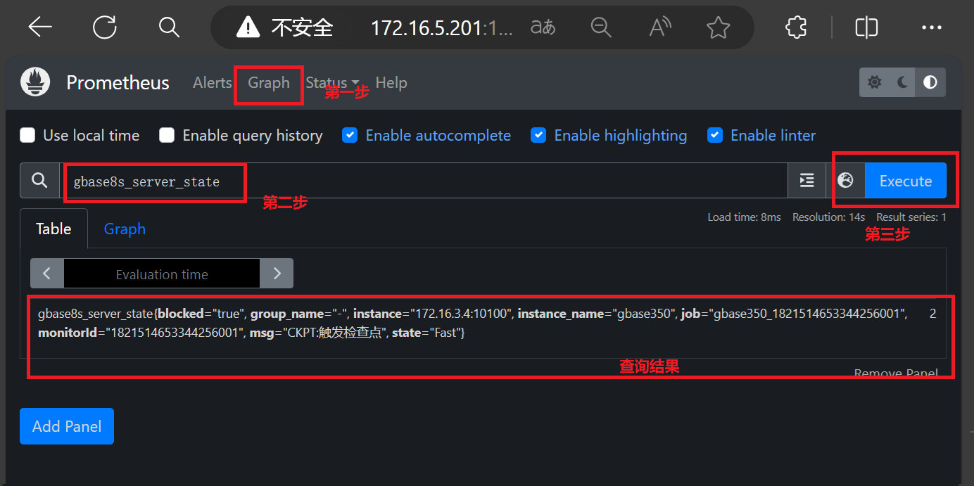 通过 http://IP:10103/ 进入Prometheus web UI 客户端,执行查询: