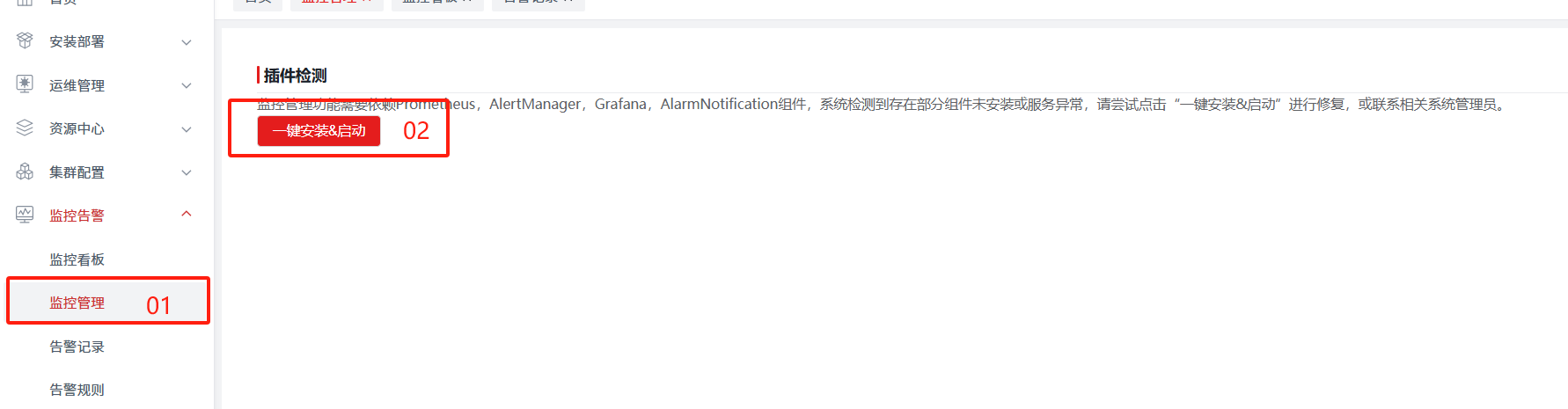首次进入监控首页,需要在【监控管理】页面点击【一键安装&启动】部署监控插件所需组件(前提:组件包GEM_components_1.x.x_x.tar.gz 解压至目录GEM_base下)。